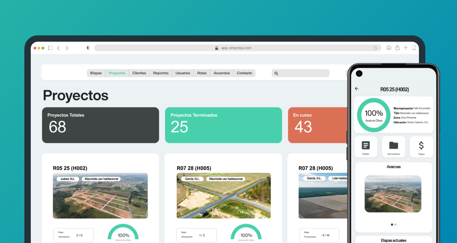 Plataforma web y móvil para clientes mayoristas que permite consultar y dar seguimiento a proyectos de construcción.