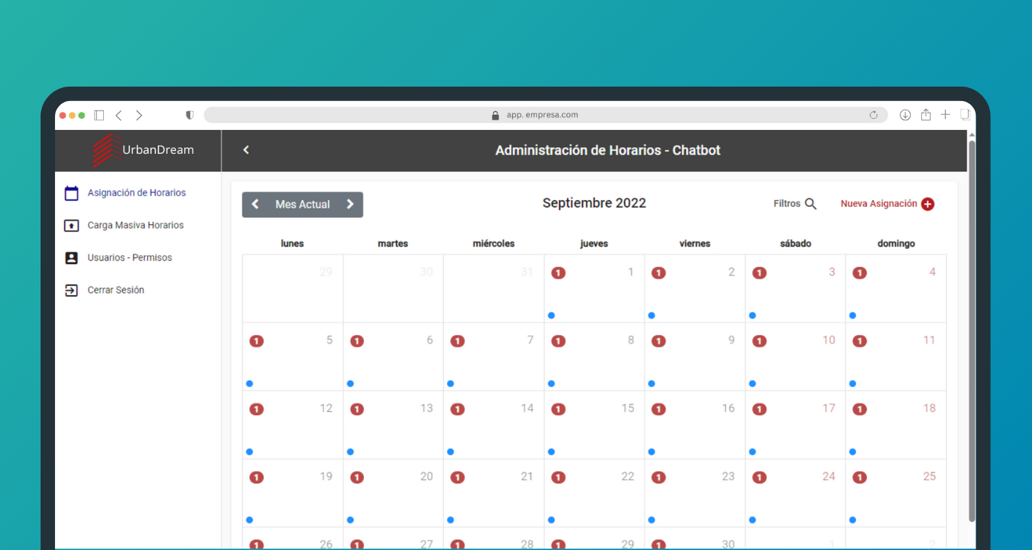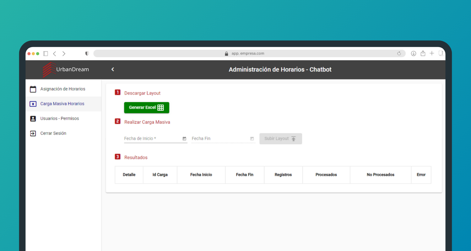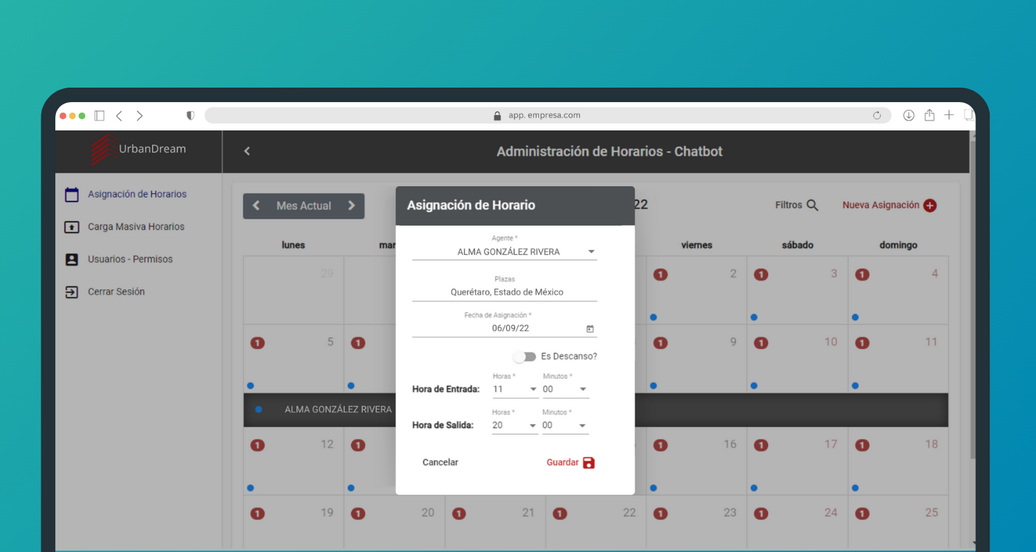 Sistema que gestiona la asignación de horarios y días laborables por empleado. Permite realizar cargas masivas, controlar permisos y generar reportes de asistencia, garantizando una administración ordenada del personal.