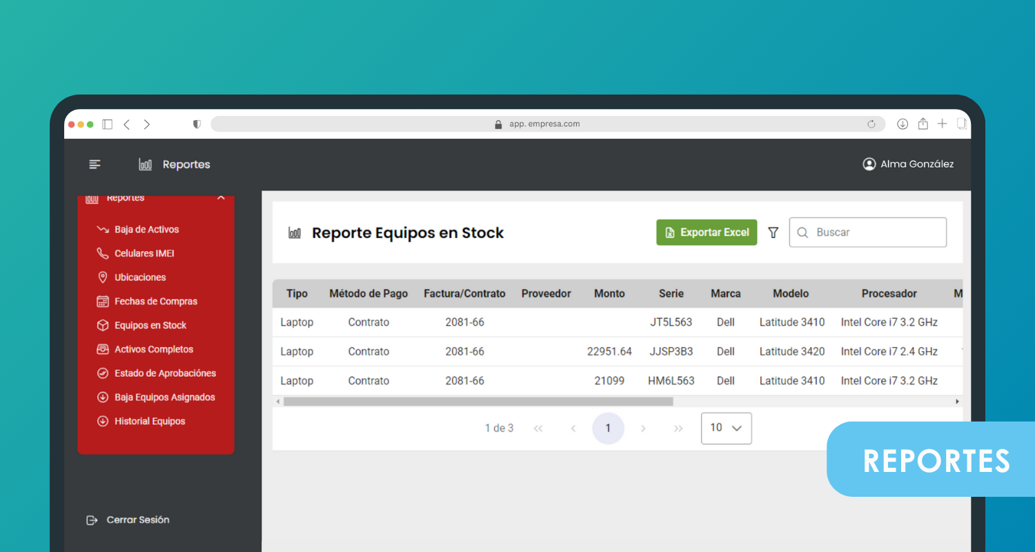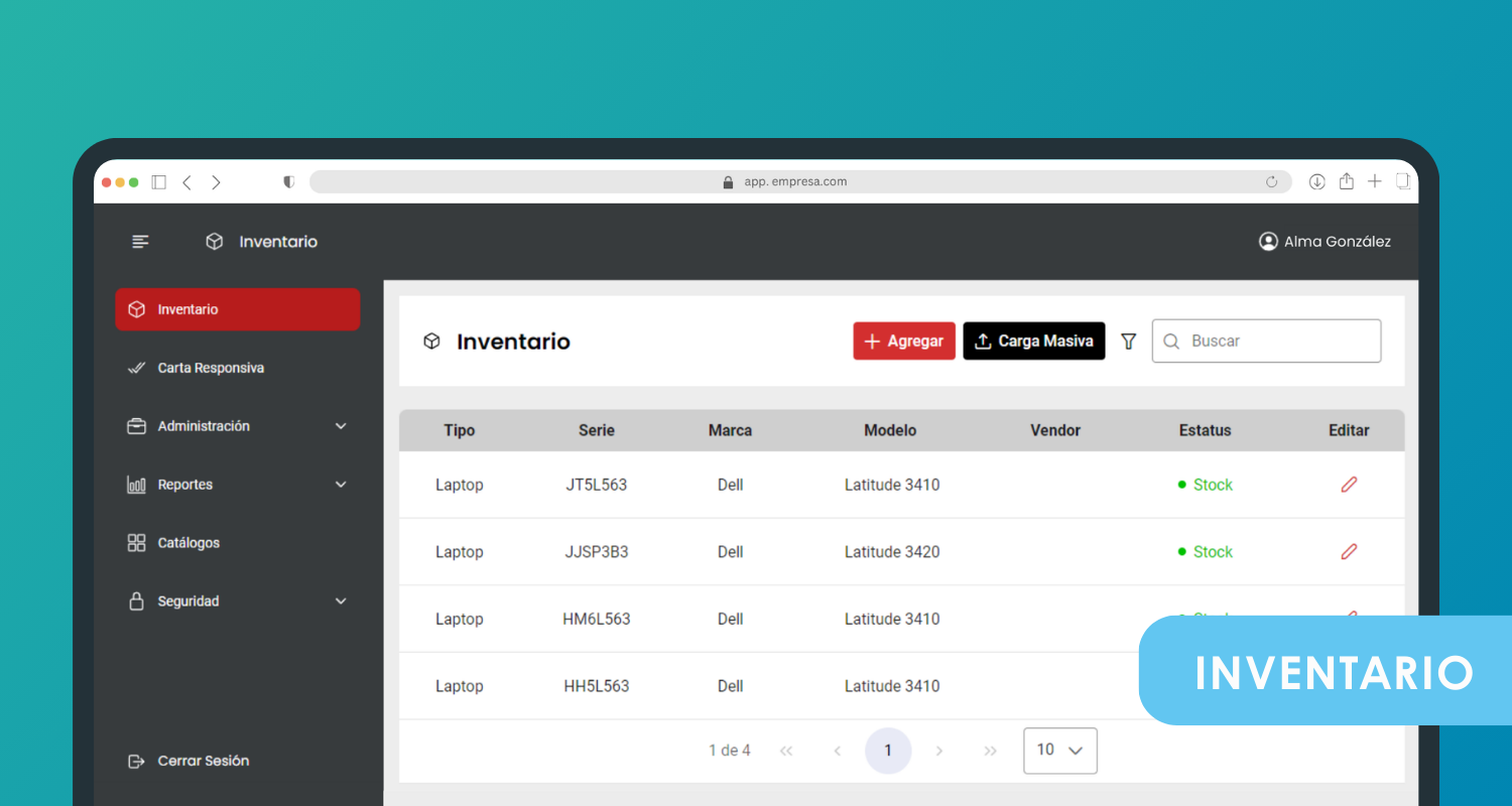 Sistema que centraliza el registro, asignación y control de activos bajo contrato o factura. Permite generar cartas responsivas, administrar catálogos, reportes y flujos de aprobación para altas, bajas o reemplazos.