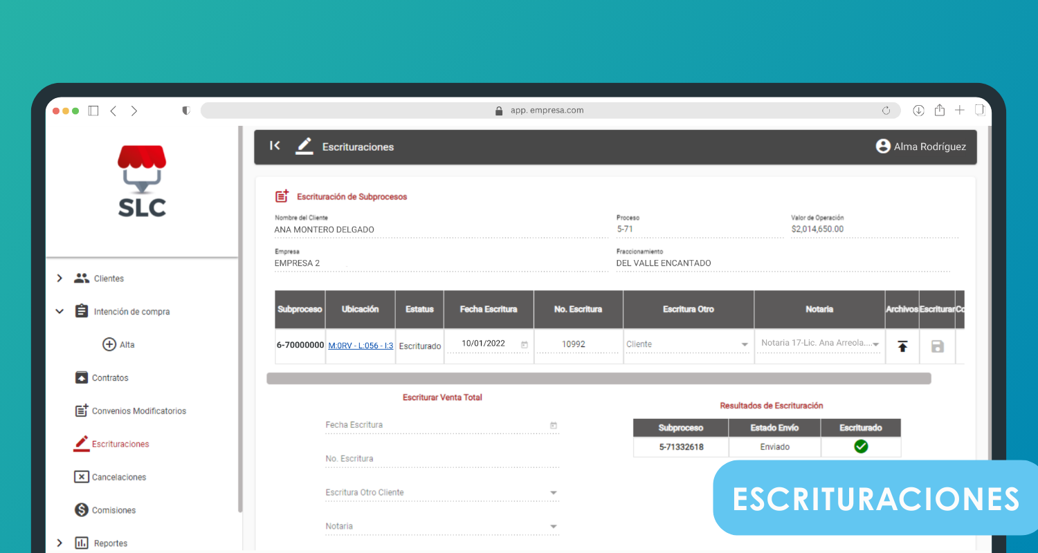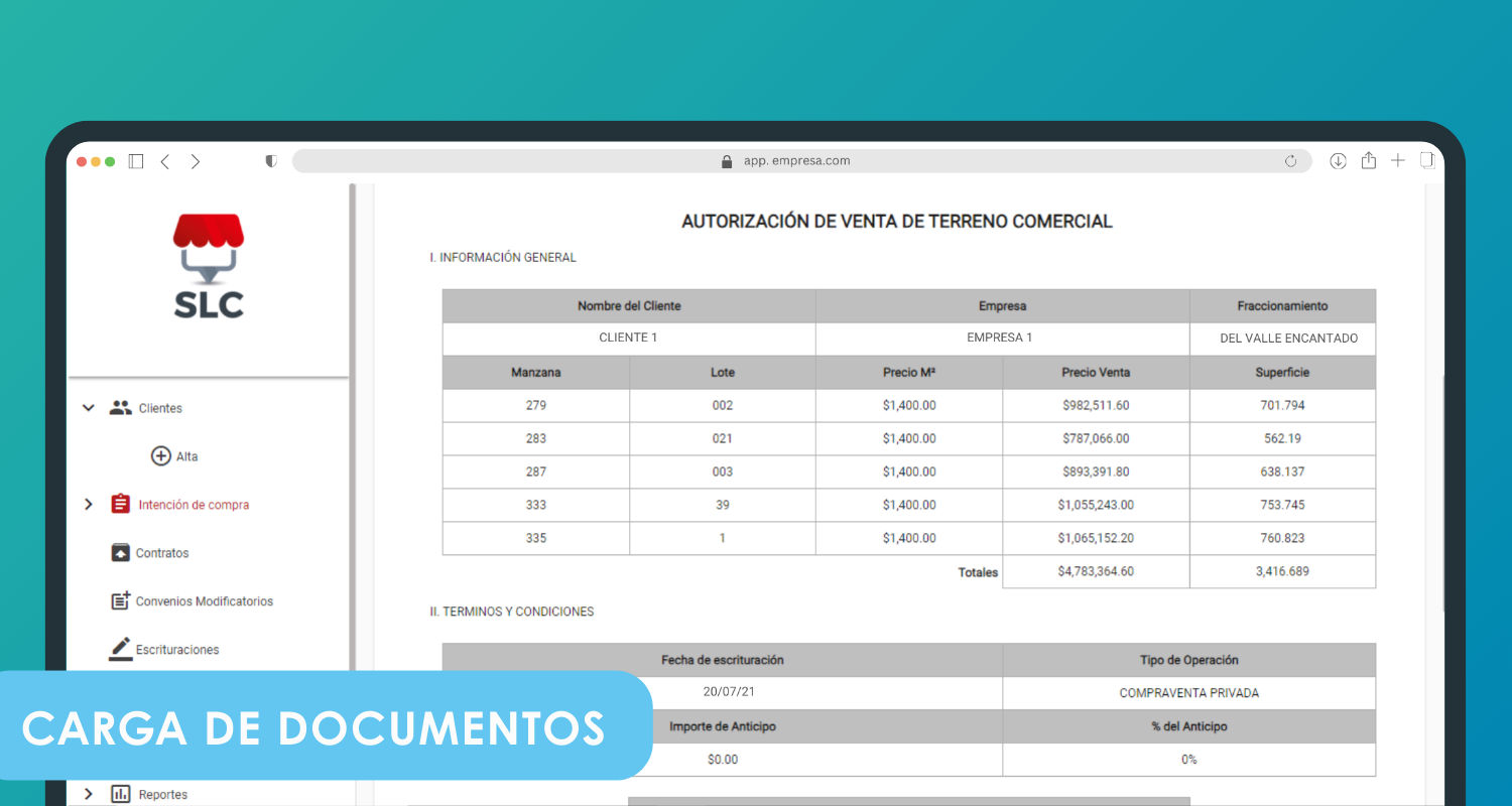 Sistema que centraliza la operación comercial de terrenos y lotes, desde la intención de compra hasta la escrituración. Permite administrar contratos, planes de pago y comisiones con conexión a cuentas por cobrar. Además, automatiza aprobaciones electrónicas y genera reportes financieros para una gestión eficiente y trazable del proceso de venta.