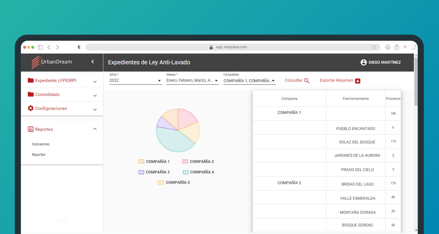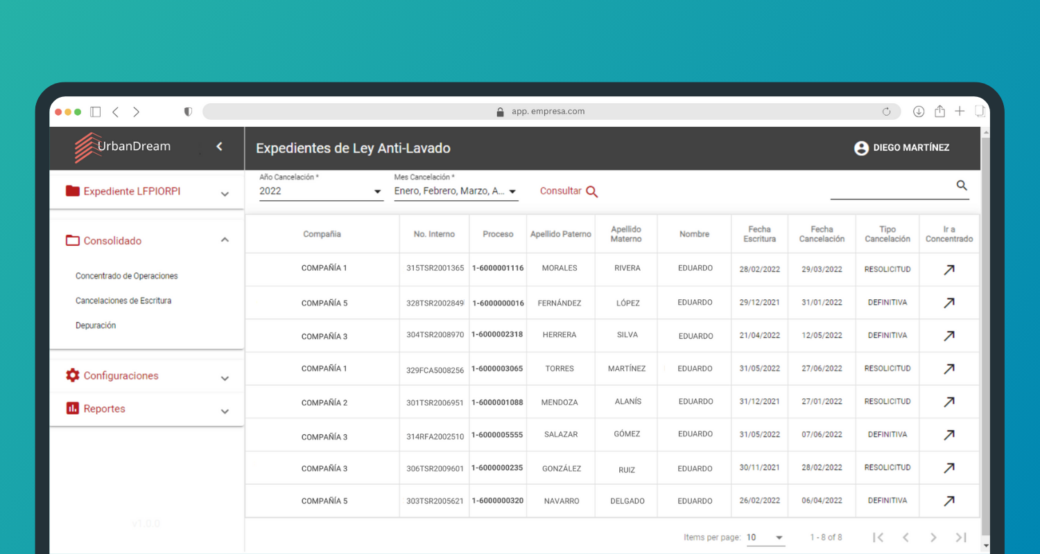 Plataforma que automatiza el registro y seguimiento de clientes por transacción inmobiliaria. Permite generar y reportar expedientes ante el SAT, identificar operaciones relevantes y consolidar información por agente o empresa.