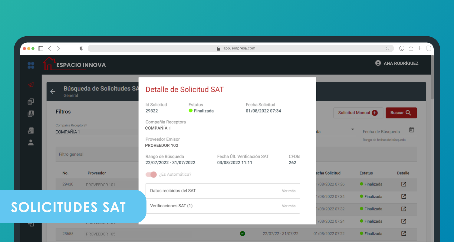 Sistema que permite a las empresas automatizar la obtención, almacenamiento y consulta de comprobantes fiscales digitales emitidos por el SAT. Facilita la gestión contable mediante búsquedas por proveedor, notificaciones automáticas y control de accesos, garantizando seguridad y trazabilidad.